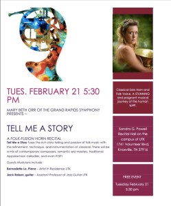 Mary Beth sings traditional Appalachian melodies from her childhood to introduce the classical works in the program. So much of classical literature is inspired by, and derived from traditional folk melodies and are far more connected and complimentary to each other than many audi- ences assume. Both of these genres communicate and elevate the human spirit and her hope is to connect with audiences from as many varied backgrounds as possible, and connect them to each other. More can be found at: marybethorr.org